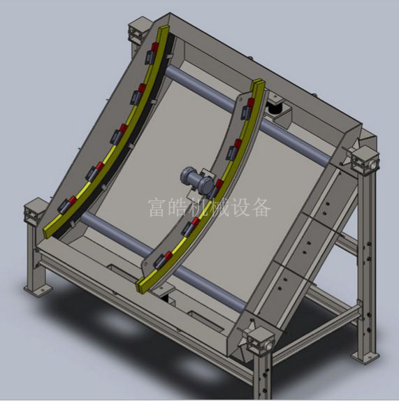弧形篩主要由篩箱、篩網(wǎng)、激振器、減振彈簧和下座架等組成。香蕉篩是由電動(dòng)機(jī)和激振器作為振動(dòng)源,激振器主要是由偏心軸、皮帶輪、軸承及軸承座等組成,激振器安裝在篩箱側(cè)板上,并由電動(dòng)機(jī)通過三角皮帶或軟連接與其相連,電動(dòng)機(jī)帶動(dòng)偏心軸旋轉(zhuǎn),產(chǎn)生離心慣性力,迫使篩箱振動(dòng)。