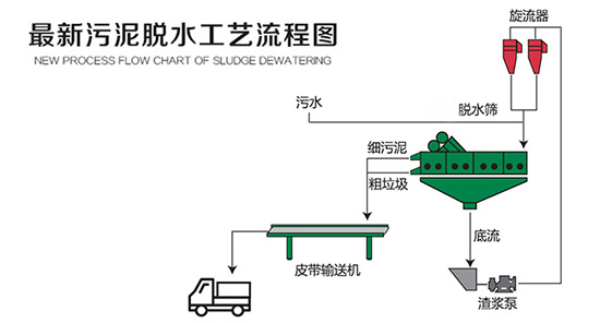 污泥脫水系統(tǒng)是使用專用渣漿泵將污水抽送至脫水篩篩面,經(jīng)由大孔徑聚氨酯篩板,將大顆沙礫、雜物等篩出,篩下泥漿經(jīng)由旋流器高效濃縮,輸送至細(xì)孔篩面,將大部分的細(xì)砂脫水干排。系統(tǒng)可加噴淋裝置,實(shí)現(xiàn)清洗、分級、脫水三種效果。